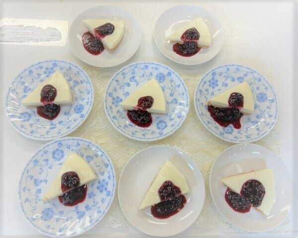おやつレクの内容は、レアチーズクリスマスケーキ〜ブルーベリーソースかけ〜を利用者様と一緒に作りました。