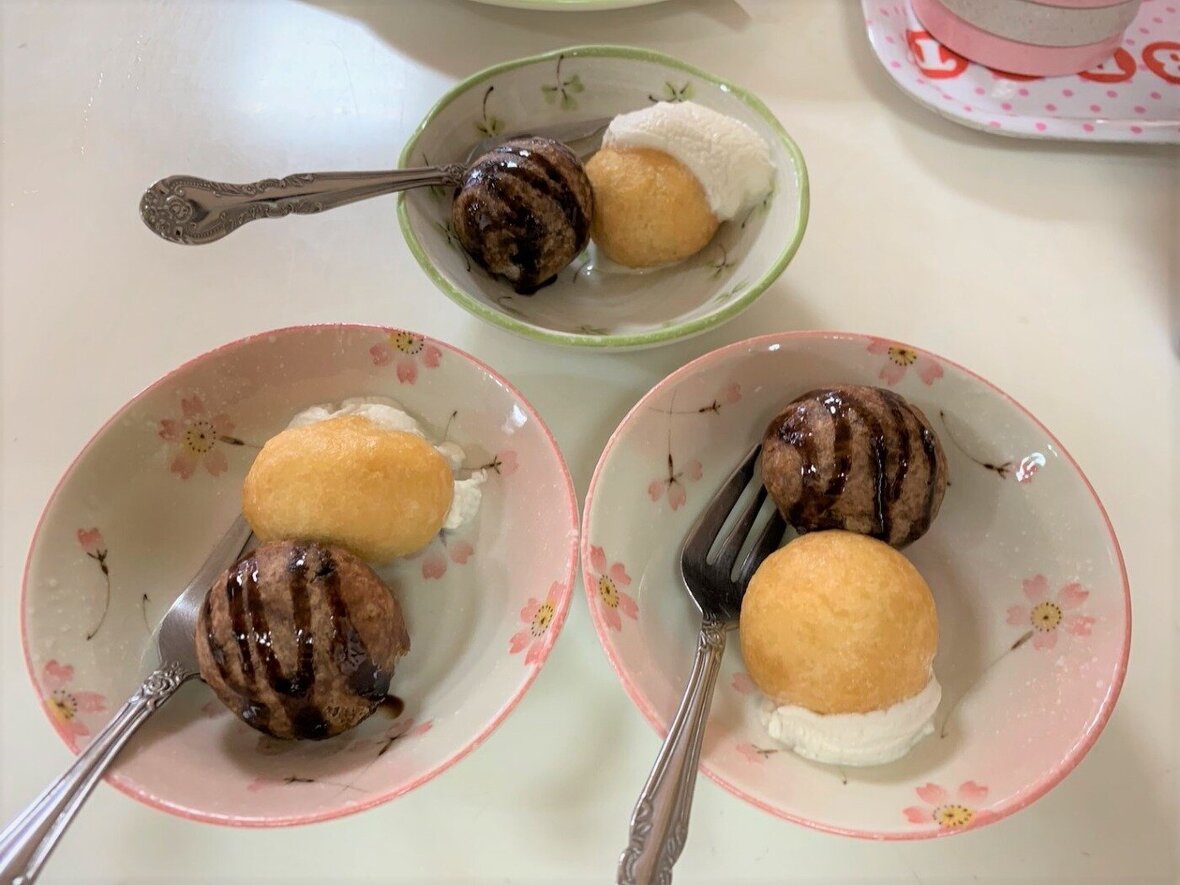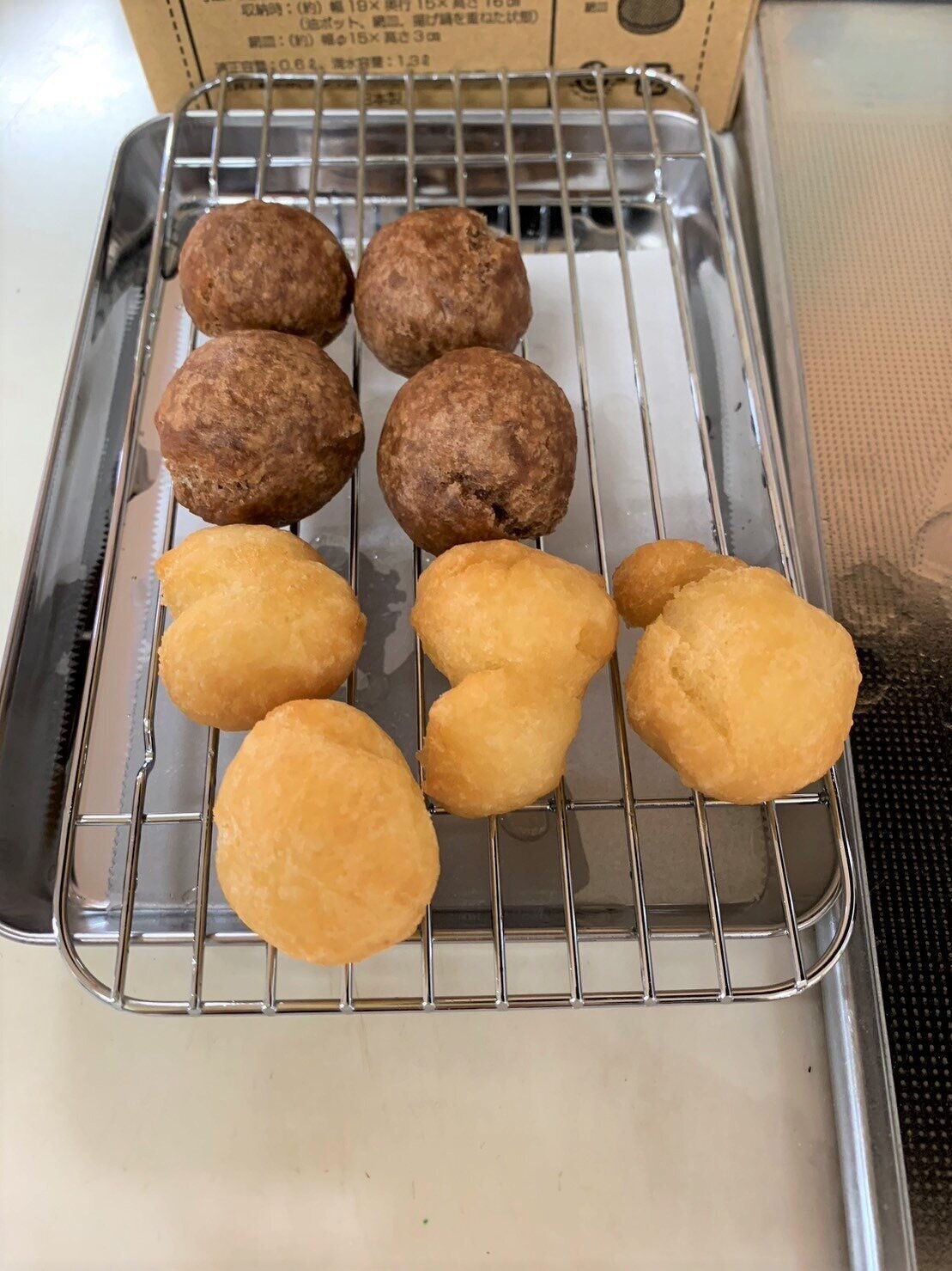 お餅を溶かしと油で揚げました。ココア味とプレーンの2種類。